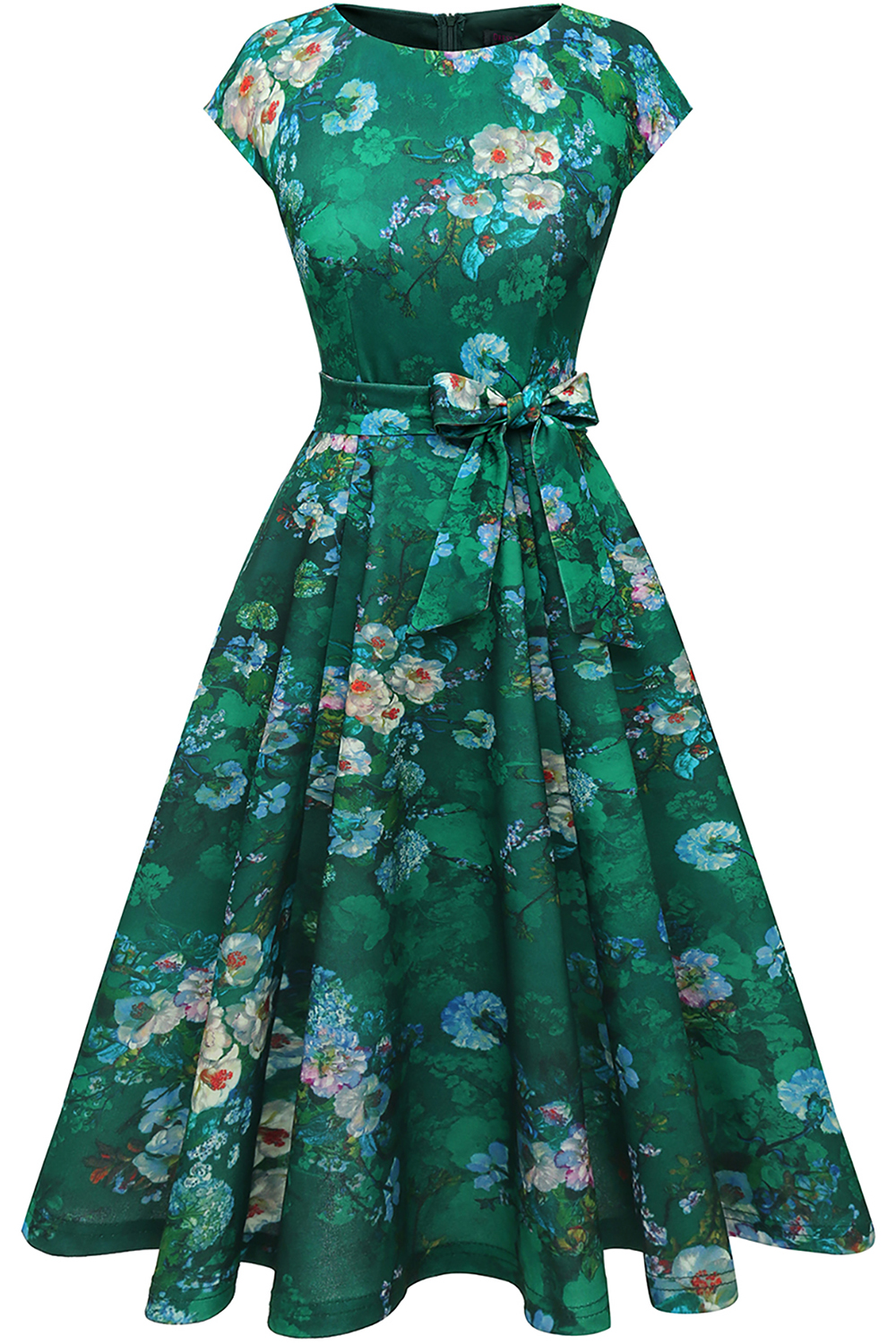 Green Flower 2025 Women's Floral Cocktail, Tea Length Wedding Guest Dresses - Vintage, Graduation, Prom & Bridesmaid with Cap Sleeves