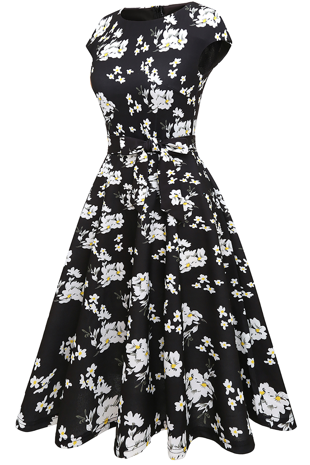 Black White Flower 2024 Women's Floral Cocktail, Tea Length Wedding Guest Dresses - Vintage, Graduation, Prom & Bridesmaid with Cap Sleeves