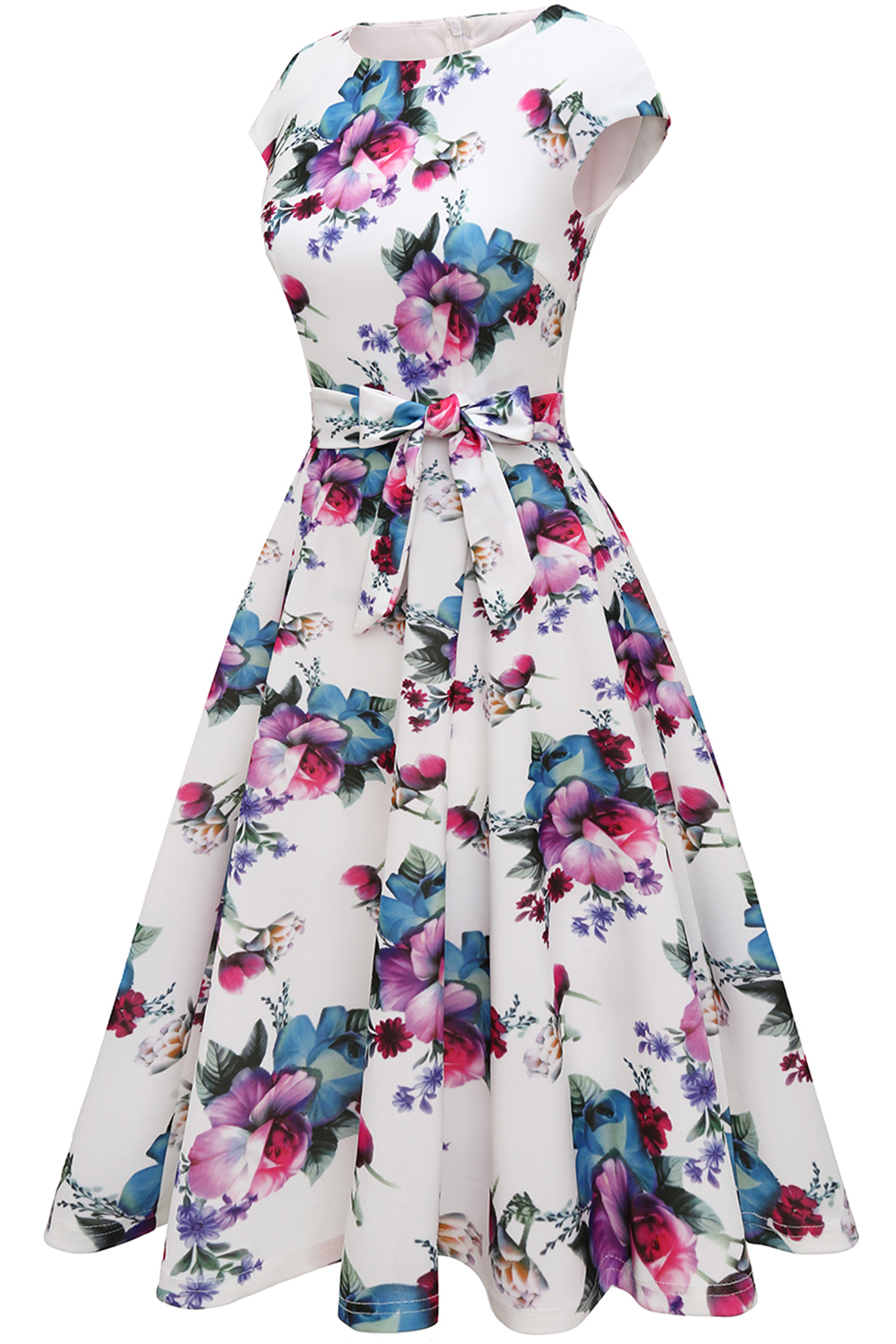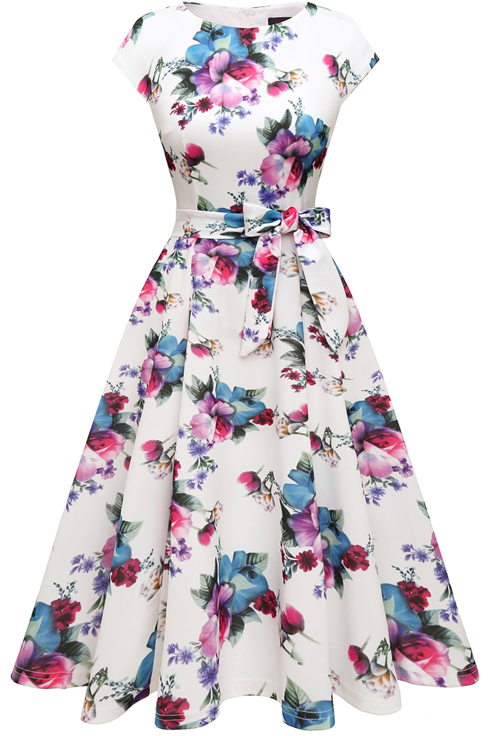 Elegant Vintage-Inspired A-Line White Floral Cocktail Dress with Cap Sleeves