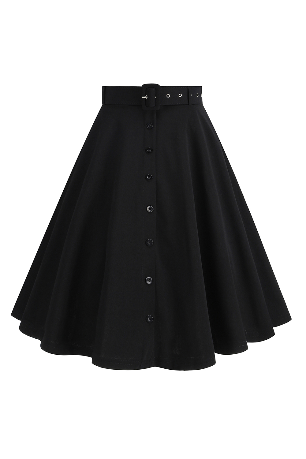 Solid Color Button-Up Belted Midi Vintage Skirt