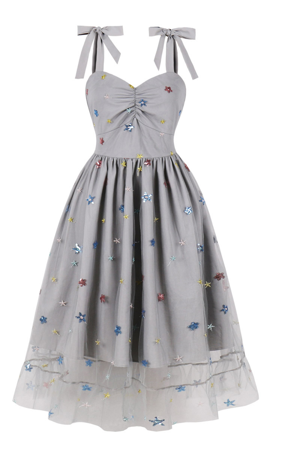 Vintage Flirty Cute Grey Spaghetti Strap A-Line Midi Dress